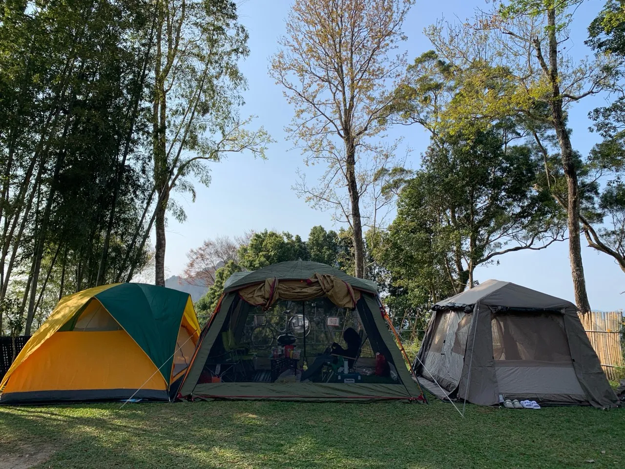 像照片中的畫面,三頂帳篷排在草地上: